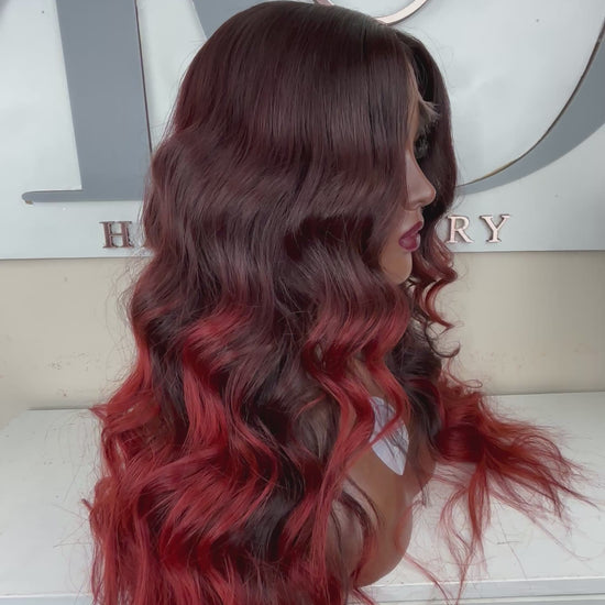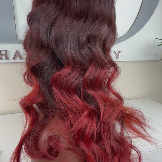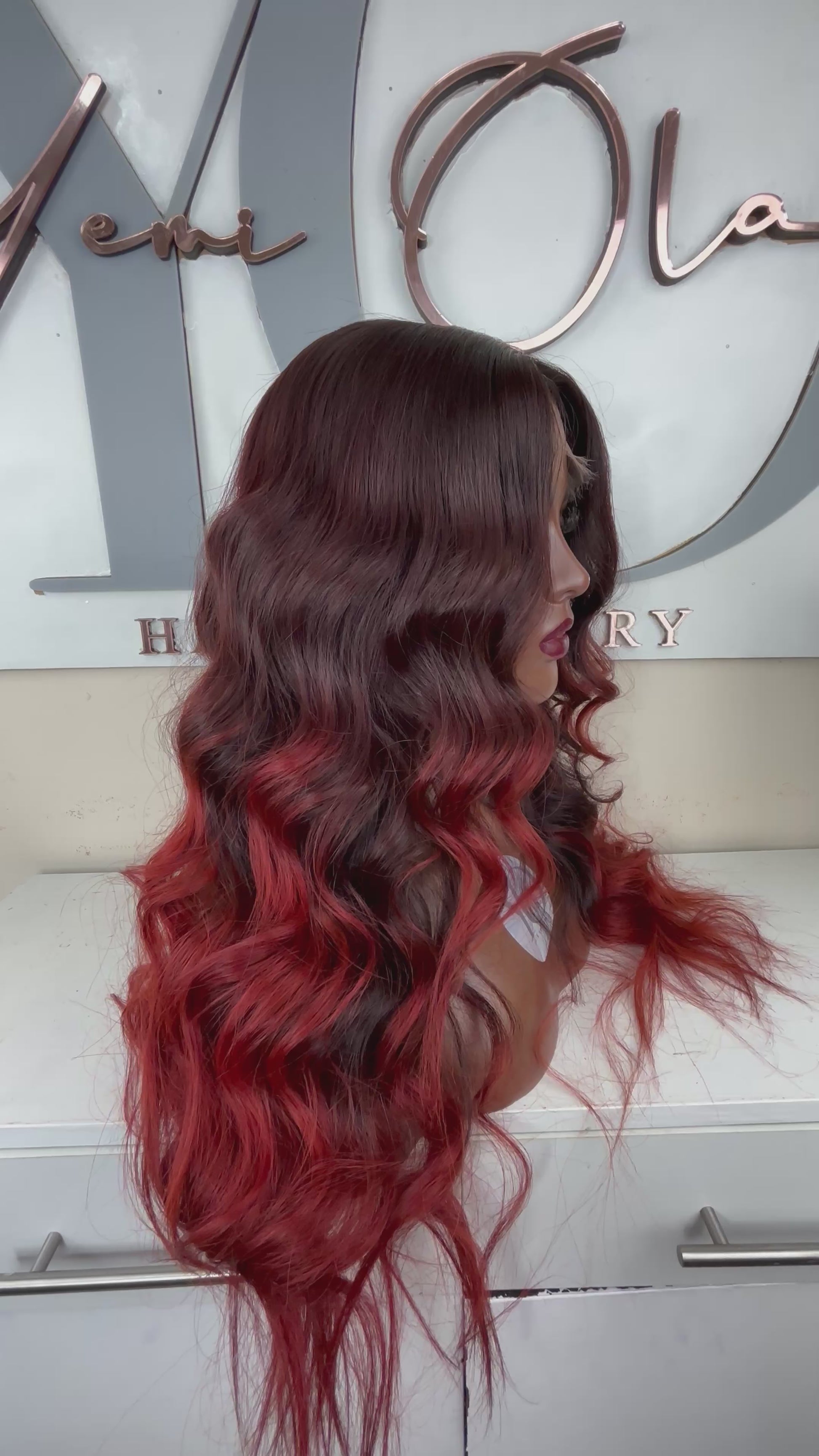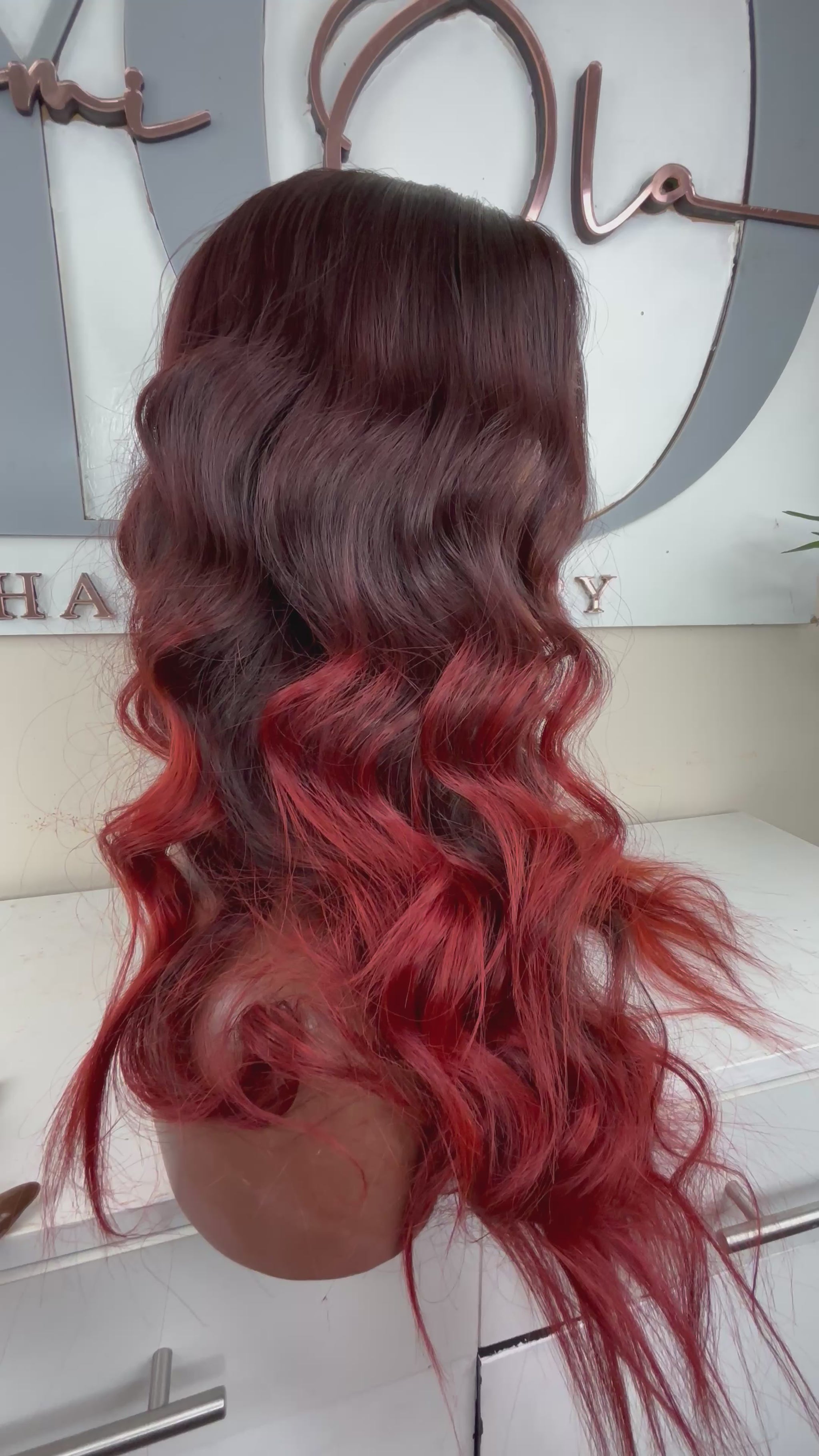 Turn heads effortlessly with Spice, a bold yet refined statement piece for the confident woman who loves to stand out with class. This 18-inch masterpiece features dark cherry roots that melt seamlessly into a vibrant bright red ombré, creating depth, dimension, and irresistible warmth.